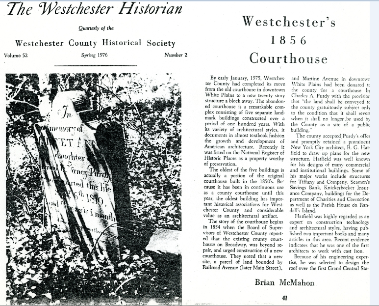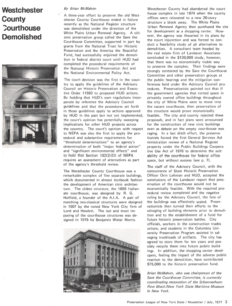 Westchester County (NY) Courthouse, White Plains, N.Y. This historic courthouse complex consisted of three buildings constructed over a fifty-year period. After the County built a new courthouse, the old courthouse was acquired by the White Plains Urban Renewal Agency which planned to demolish it. McMahon did extensive research on the buildings and published several articles. He organized the Save the Courthouse Committee which succeeded in having the complex listed on the National Register. White Plains, working with the U.S. Department of Housing and Urban Development, continued with plans for demolition, prompting the Committee to file a lawsuit in federal court. The court enjoined the demolition and required HUD to comply with the National Historic Preservation Act and the National Environmental Policy Act. This was the first decision in the country to apply the guidelines of the Advisory Council on Historic Preservation and Executive Order 11593 to a proposed HUD action. The resultant Environmental Impact Statement (EIS,) undertaken by noted architect Harmon Goldstone, showed promising options and alternatives, but after completing the required EIS, the city demolished the courthouse to make way for a shopping center.