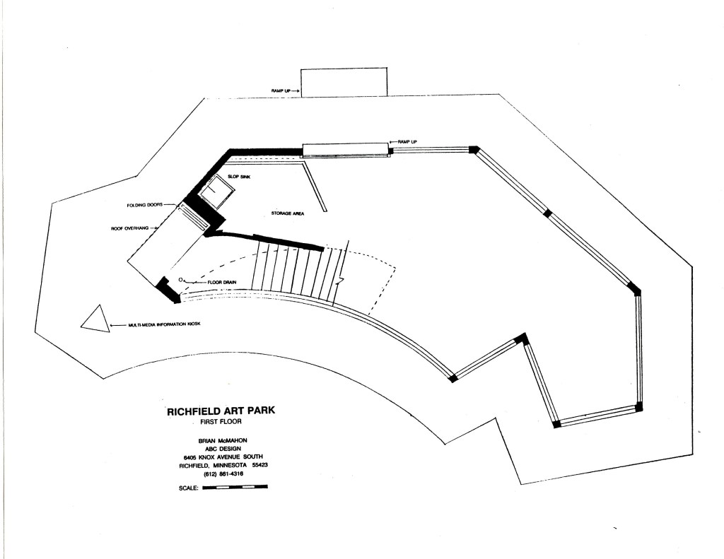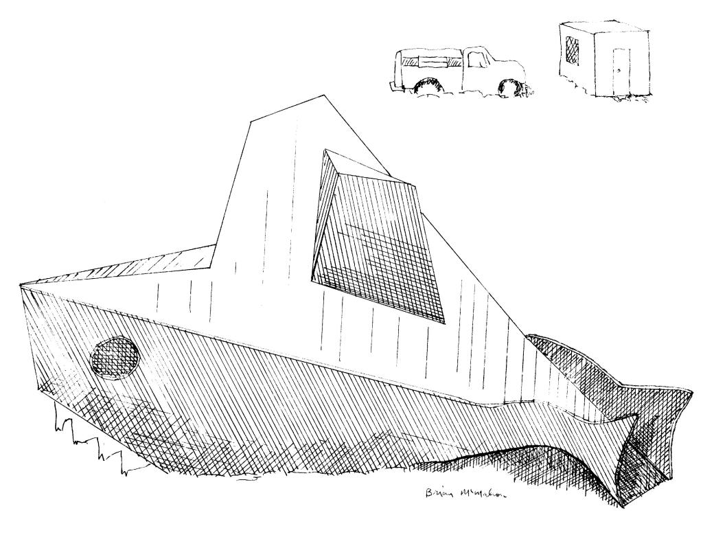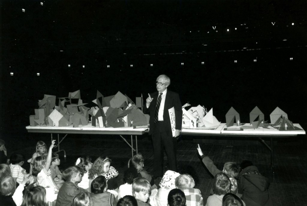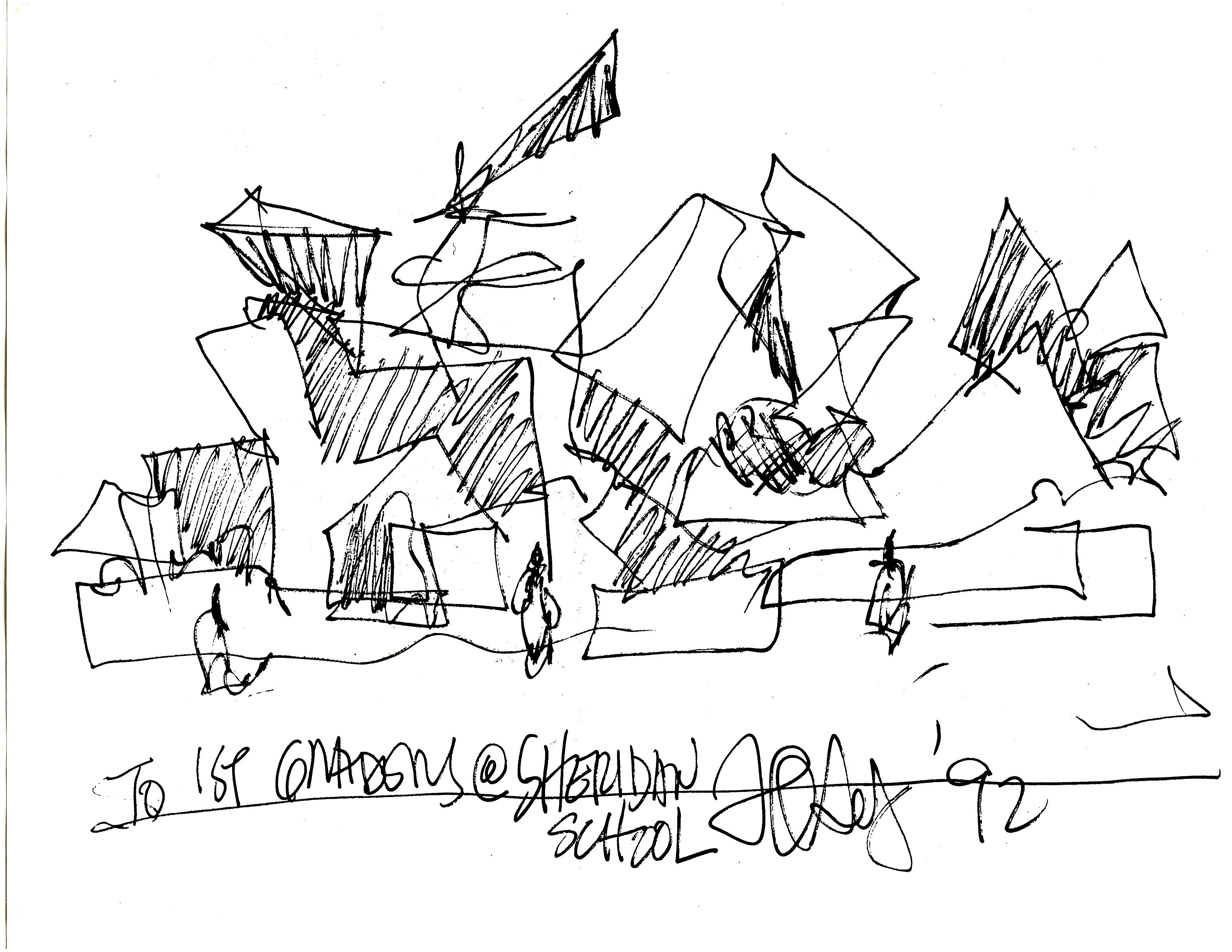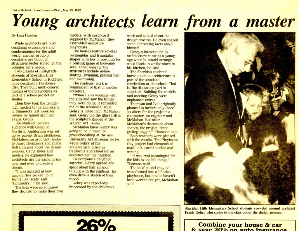 In 1992 Brian McMahon worked as a volunteer teaching design at his daughter’s first grade class. Students made models of an abstract playhouse. This was happening at the same time that architect Frank Gehry was completing the Weisman Art Museum at the University of Minnesota. Brian arranged to have Gehry ‘critique’ the student projects which were displayed on the stage of the Northrop Auditorium. Gehry did a quick sketch of the models which he presented to the class.