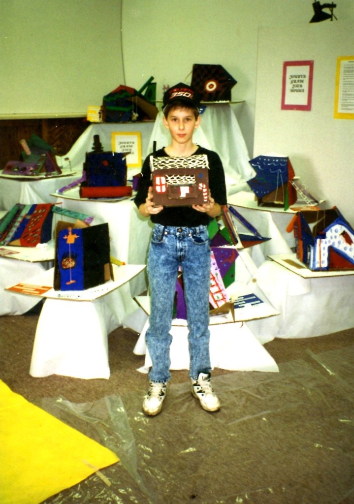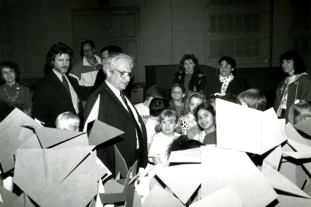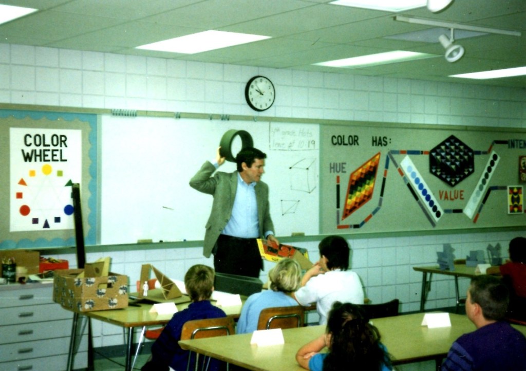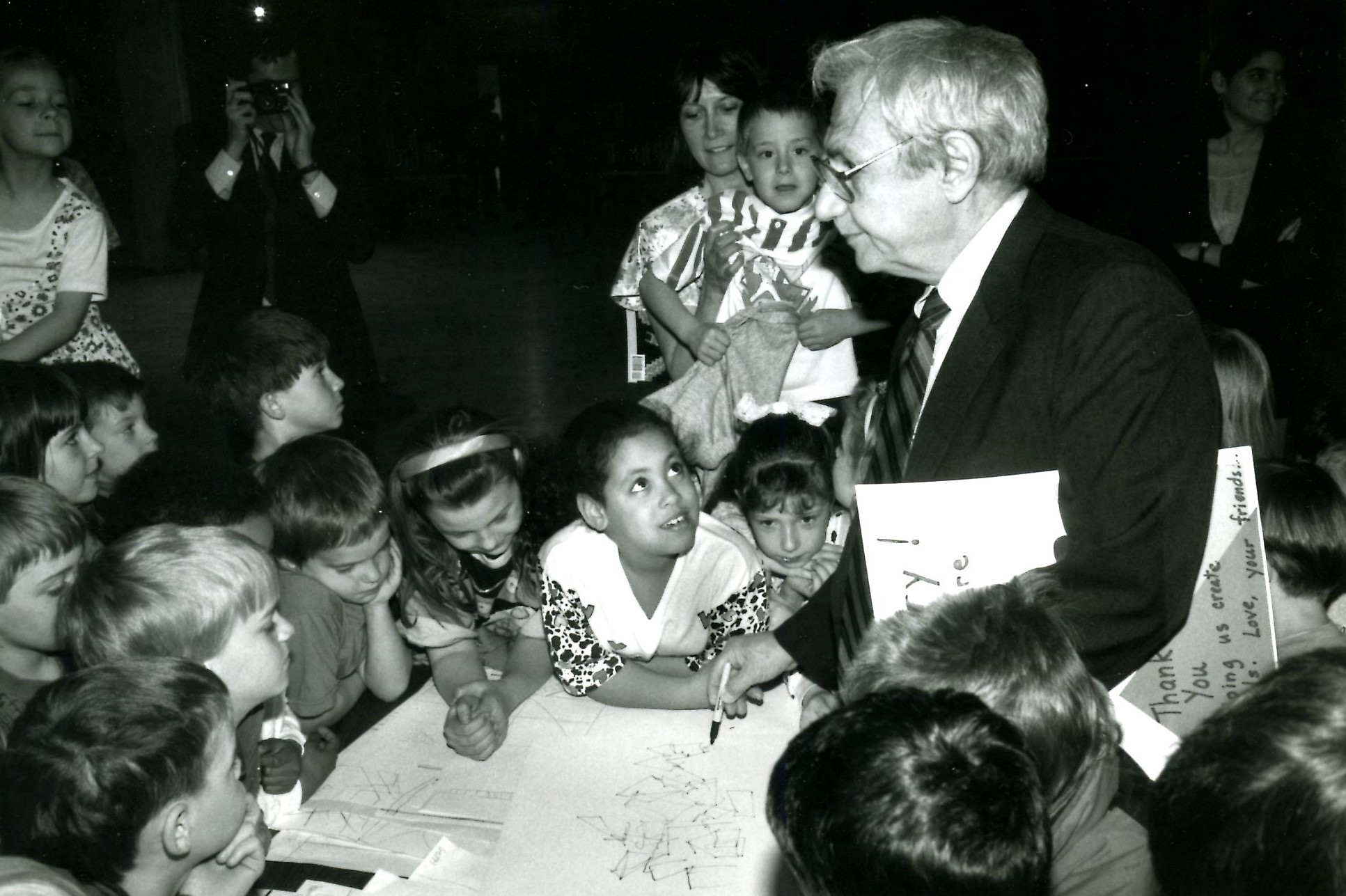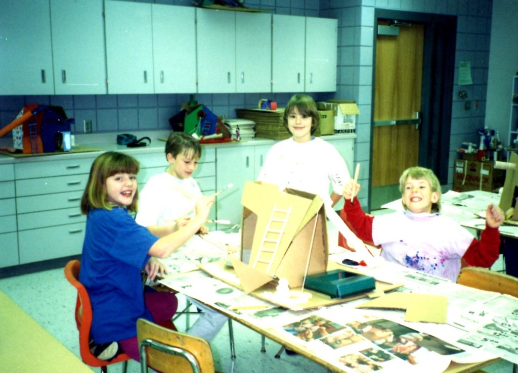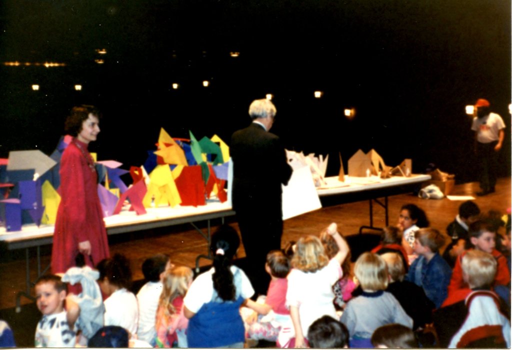 In 1992 Brian McMahon worked as a volunteer teaching design at his daughter’s first grade class. Students made models of an abstract playhouse. This was happening at the same time that architect Frank Gehry was completing the Weisman Art Museum at the University of Minnesota. Brian arranged to have Gehry ‘critique’ the student projects which were displayed on the stage of the Northrop Auditorium. Gehry did a quick sketch of the models which he presented to the class.