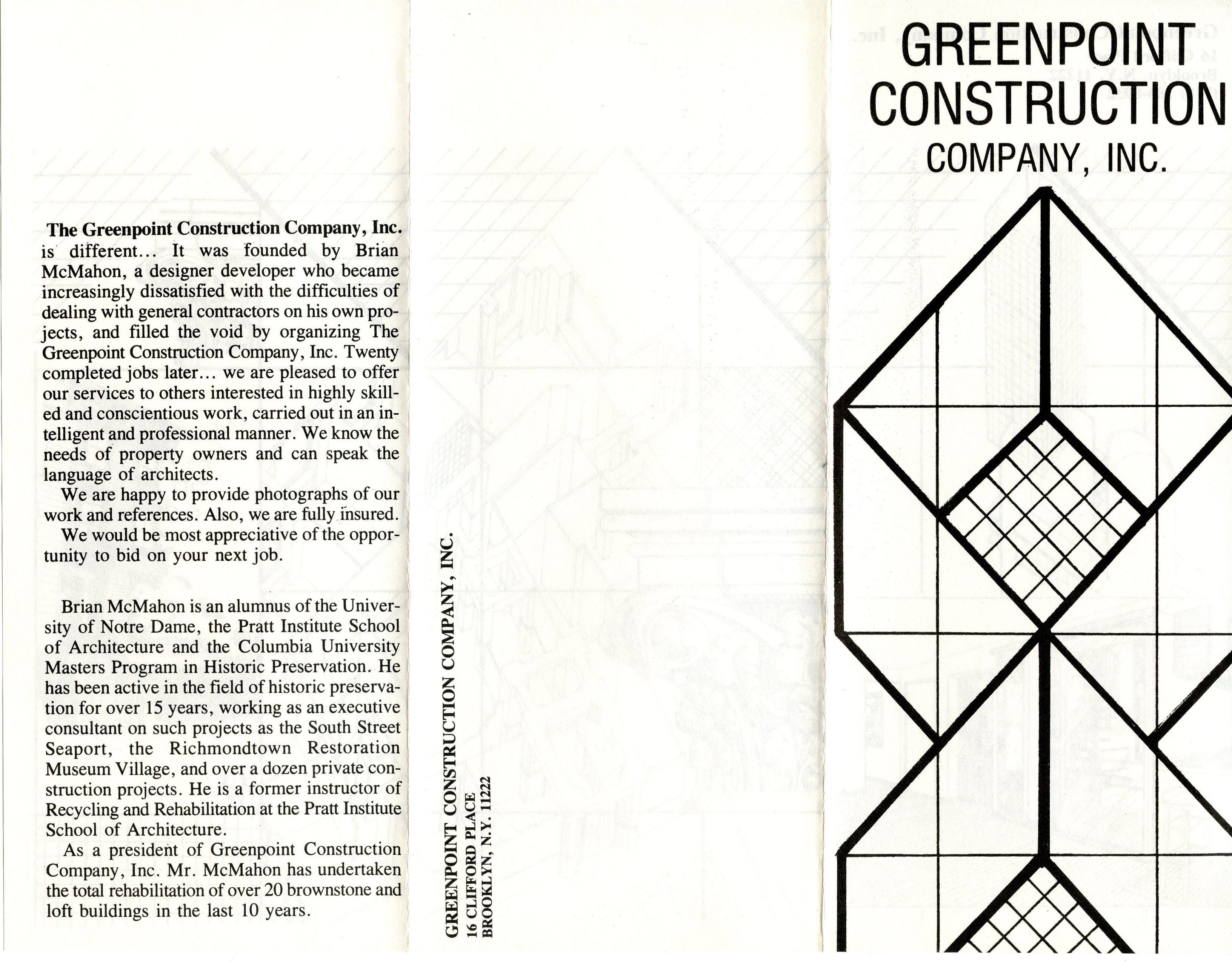 Brian McMahon established Greenpoint Construction as a design-build company to work on his development projects and those of other property owners. Teresa McMahon, Brian’s wife, managed a crew of about thirty workers doing more than forty projects in the 1980s.